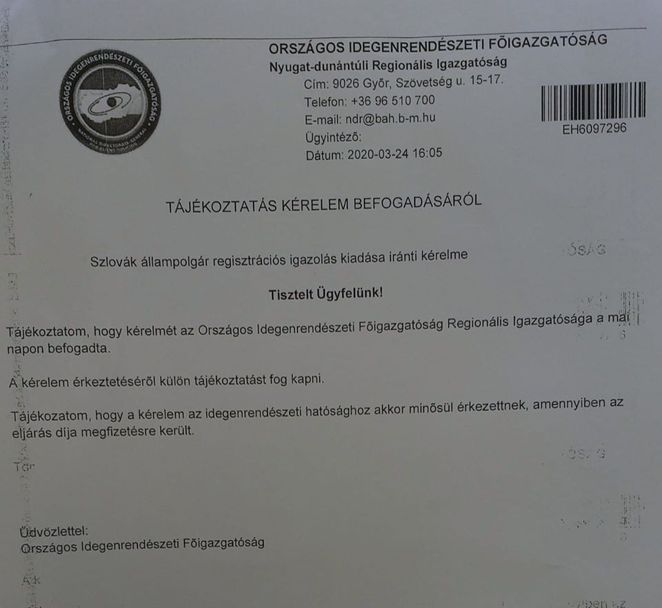 - ak je všetko v poriadku, z Györu z Cudzineckej polície dojde potvrdenie: "Tájékoztatás kérelem befogadásról" (viď nižšie vzory tlačív)